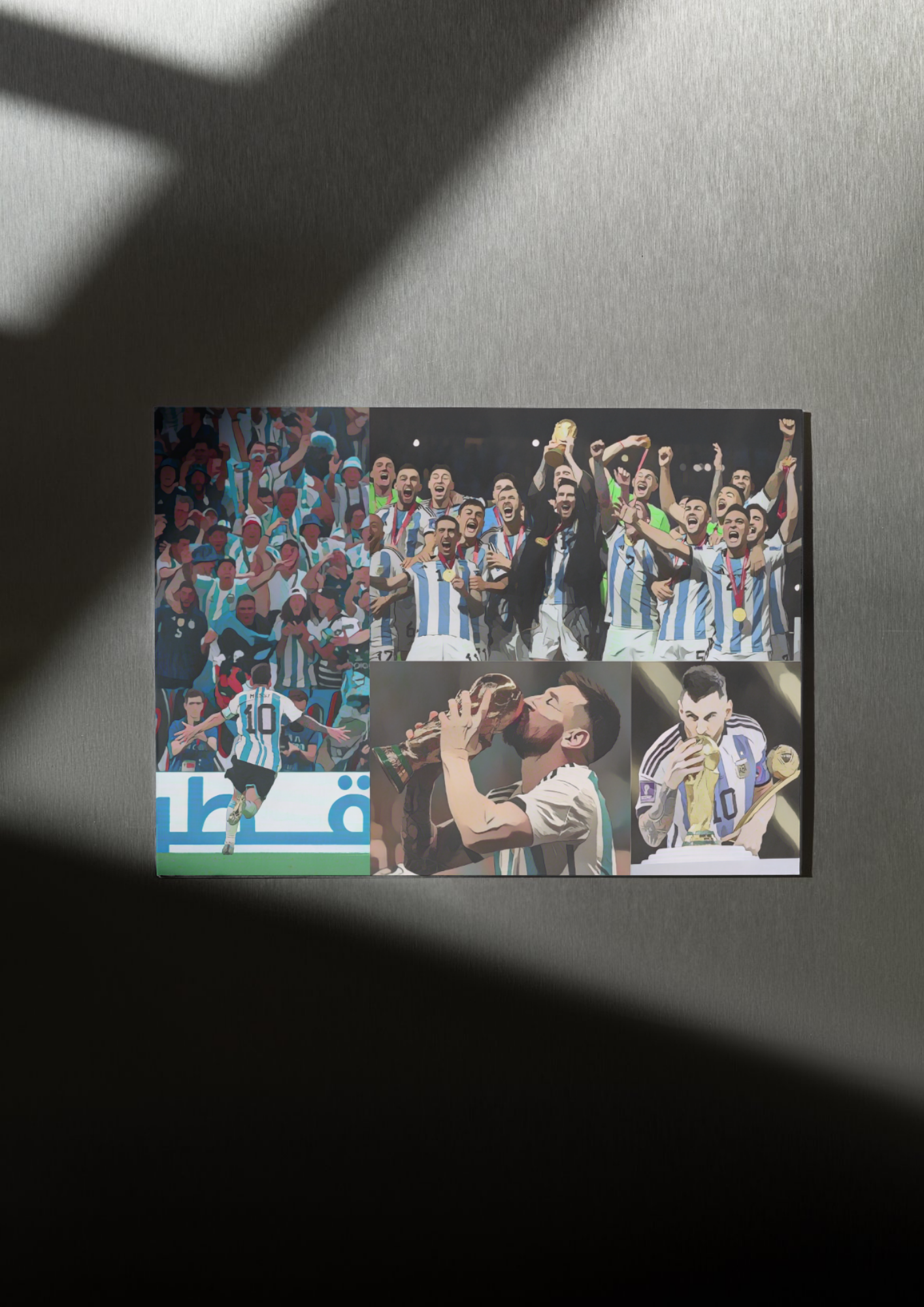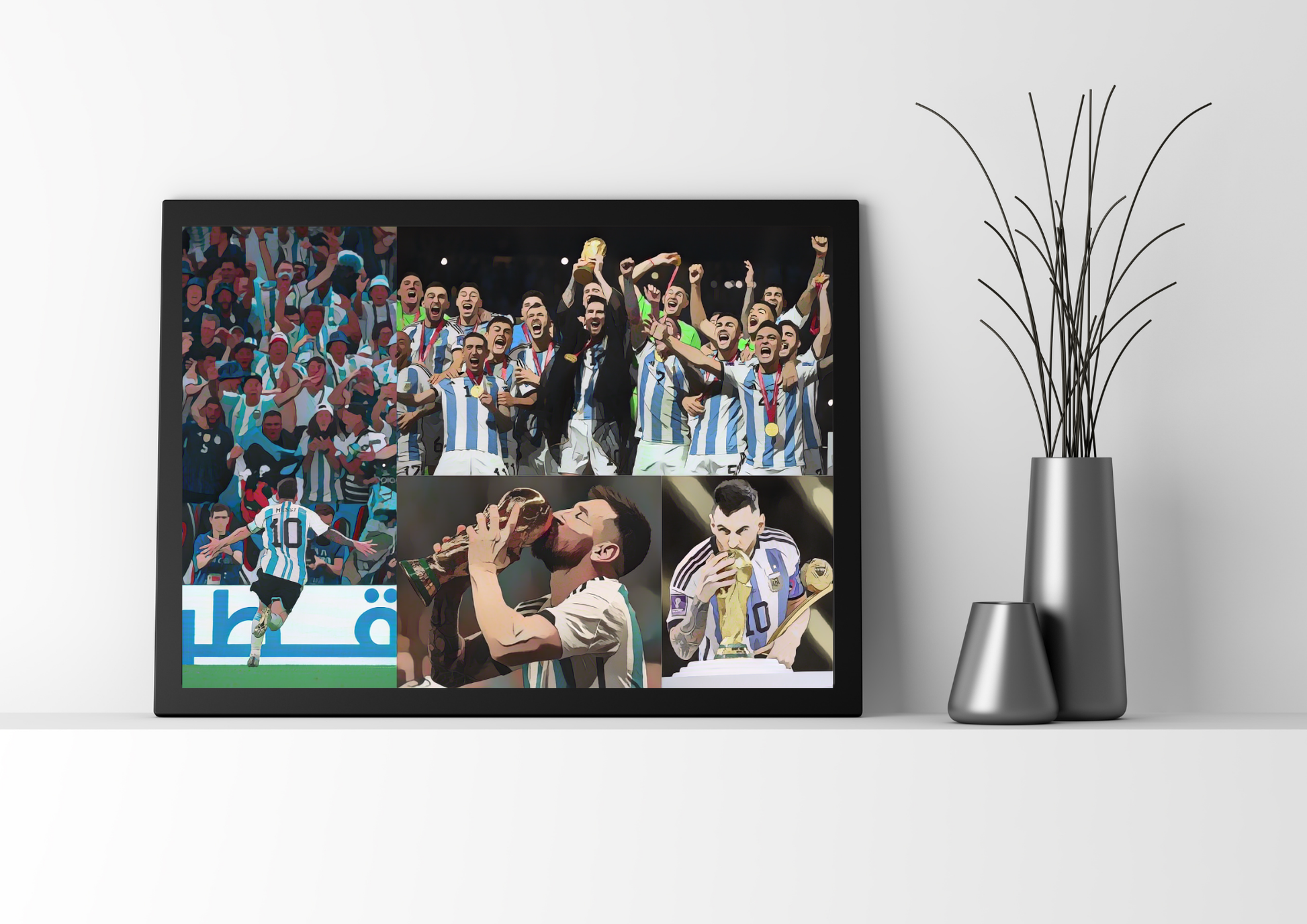 Immortalise one of football's greatest moments with this stunning World Cup victory collage, beautifully presented on premium A4 photo paper. This artistically crafted piece captures the pure emotion and triumph of Argentina's historic 2022 World Cup victory through a series of carefully selected images. The collage features iconic celebrations, the trophy lift, and moments of pure jubilation that will forever be etched in sporting history. Available with your choice of sophisticated black or elegant white A4 frame, this high-quality print brings every detail to life with exceptional clarity and vibrant colours. The perfect piece of memorabilia for football enthusiasts and collectors alike, this collage serves as a lasting tribute to an unforgettable achievement in the beautiful game. The carefully curated layout showcases the raw emotion, determination, and ultimate glory of this momentous sporting occasion. Display this piece proudly in your home, office, or games room to relive the magic of that extraordinary December night in Qatar.