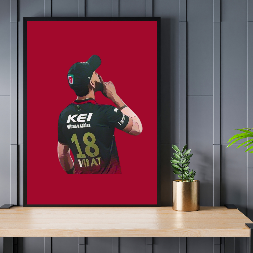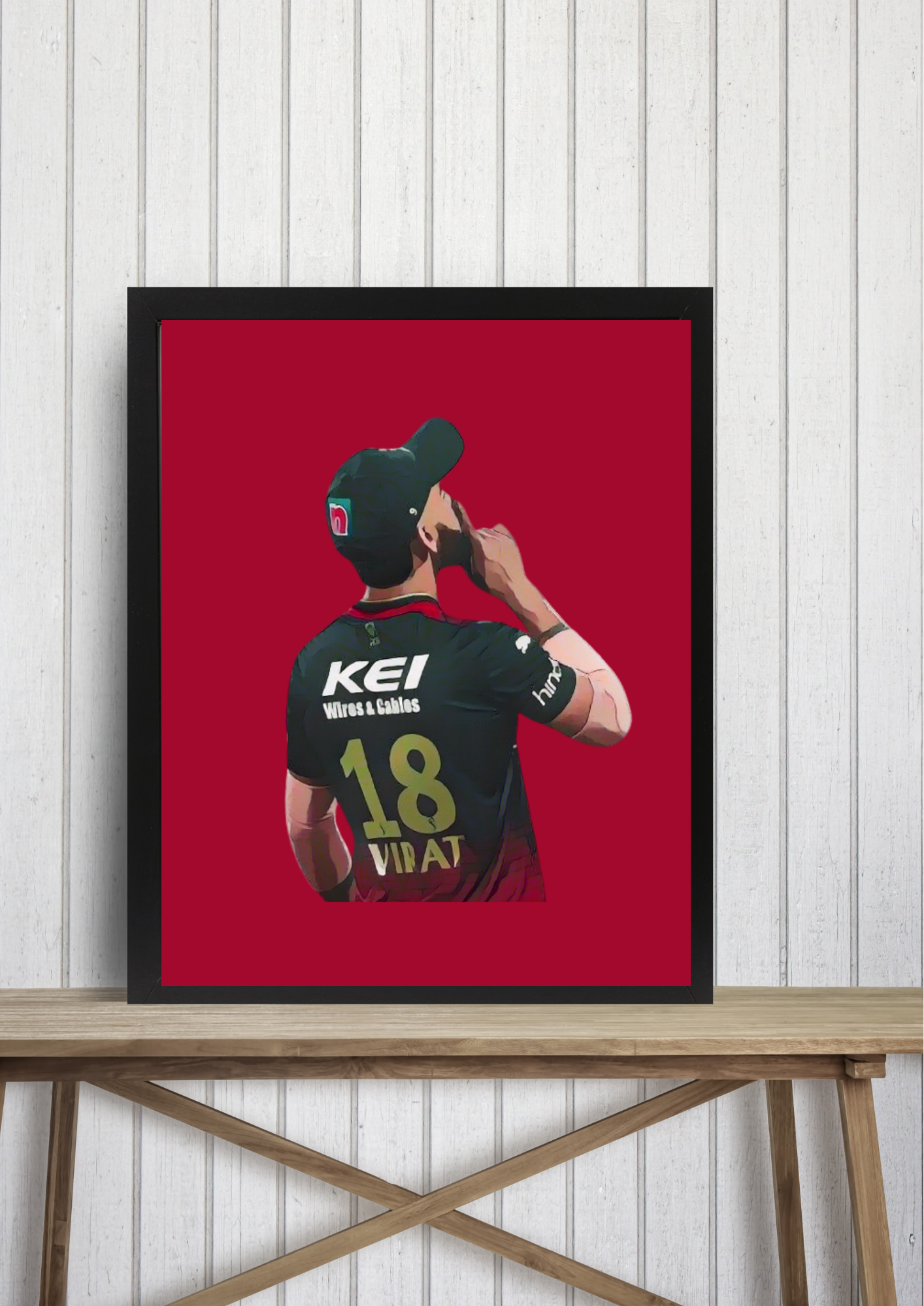 dd a striking piece of cricket memorabilia to your space with this stylish A4 framed poster featuring a dramatic artistic rendition of a cricket jersey. Set against a bold red background, this contemporary wall art captures an Virat Kohli iconic number 18 jersey. The sleek black frame provides a perfect contrast to the vibrant artwork within. This modern sports artwork makes for an eye-catching addition to any cricket enthusiast's room, office, or entertainment area. The artistic composition showcases the back view of the jersey, creating an air of anticipation and dynamism. Whether you're decorating a sports bar, fan cave, or simply want to showcase your passion for cricket, this professionally framed poster delivers both visual impact and conversation-starting appeal.